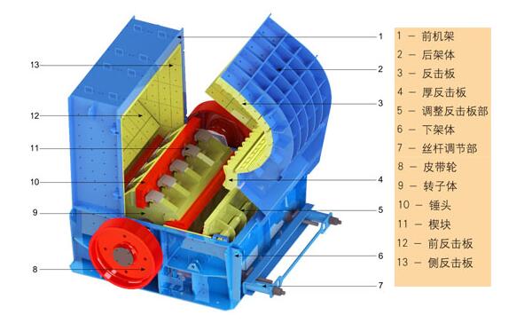 2.采用有鍵錐套聯(lián)接的轉(zhuǎn)子體、插入安裝的高效耐磨板錘、獨(dú)特的齒形反擊襯板、多方位開門機(jī)架、絲桿或液壓開啟裝置等,使設(shè)備更換易損件、檢修更加方便。